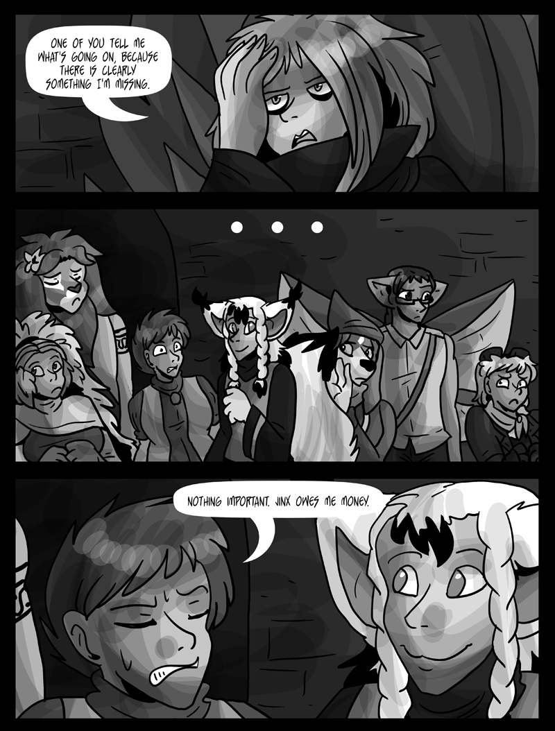 Welcome to February here's this week's Ace update! Every now and then I decide I super gotta do a biiiiig group pic for no real reason, and I thought sending Ace to town was a perfect excuse. So I borrowed a bunch of people's characters so I didn't have to like. Actually design some background characters. Lol. Super extra one-panel update! The rest of the volume will not have quite so many characters.