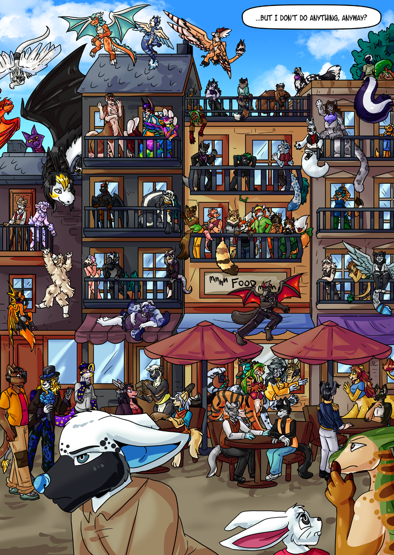 Welcome to February here's this week's Ace update! Every now and then I decide I super gotta do a biiiiig group pic for no real reason, and I thought sending Ace to town was a perfect excuse. So I borrowed a bunch of people's characters so I didn't have to like. Actually design some background characters. Lol. Super extra one-panel update! The rest of the volume will not have quite so many characters.